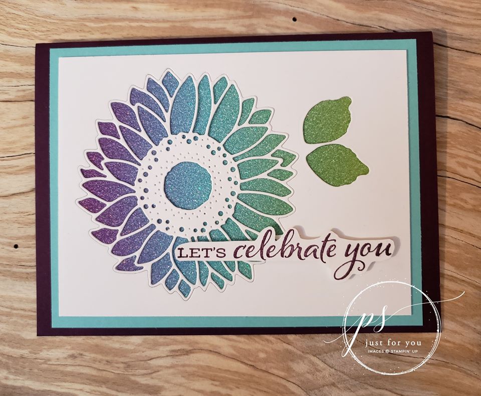 Adhere the silver foil to the Whisper White cardstock. Adhere, using Stampin’ Dimensionals to the center of the card.